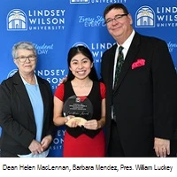 Lindsey Wilson University graduate student Barbara Mendez of Liberty, KY, (center), receives the first-place award in the inaugural School of Graduate Business & Technology Student Showcase from School of Graduate Business and Technology Dean Helen MacLennan and President William T. Luckey Jr. on Saturday, Dec. 13, in Roberta D. Cranmer Dining & Conference Center. Not present is Mendez’s project partner, Shawna Kidd of Morehead, KY.