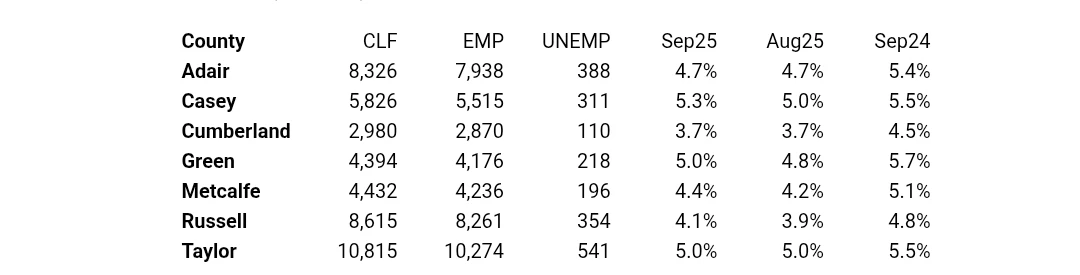 Unemployment rates fell in 116 counties, including Adair and all surrounding counties, rose in Clinton, Wayne and Ballard counties, and stayed the same in Logan County, between September 2024 and September 2025, according to the Kentucky Center for Statistics (KYSTATS), an agency within the Kentucky Education and Labor Cabinet.