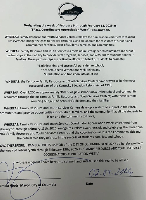 The week of February 9-13, 2026 has been designated as "FRYSC Coordinators Appreciation Week," in Columbia as a result of a proclamation issued by Columbia Mayor Pamela Hoots.